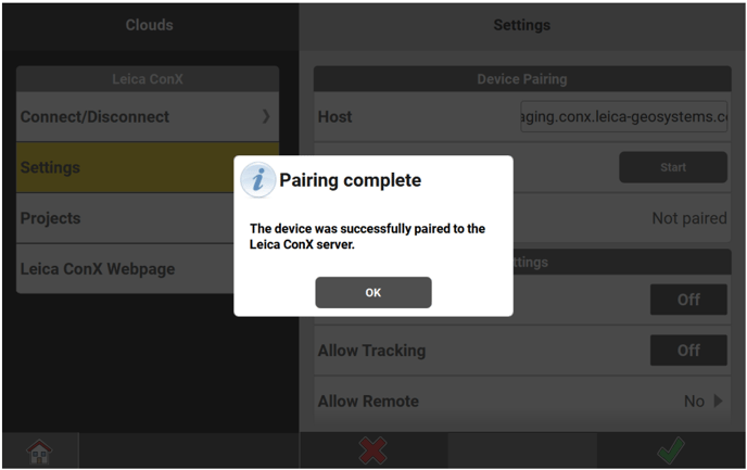 Status bar TPS - Tap Leica ConX Settings and set Host to conx.leica-geosystems.com.