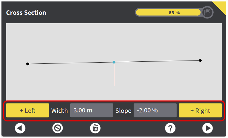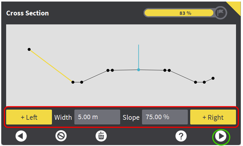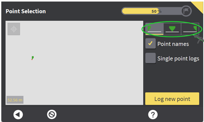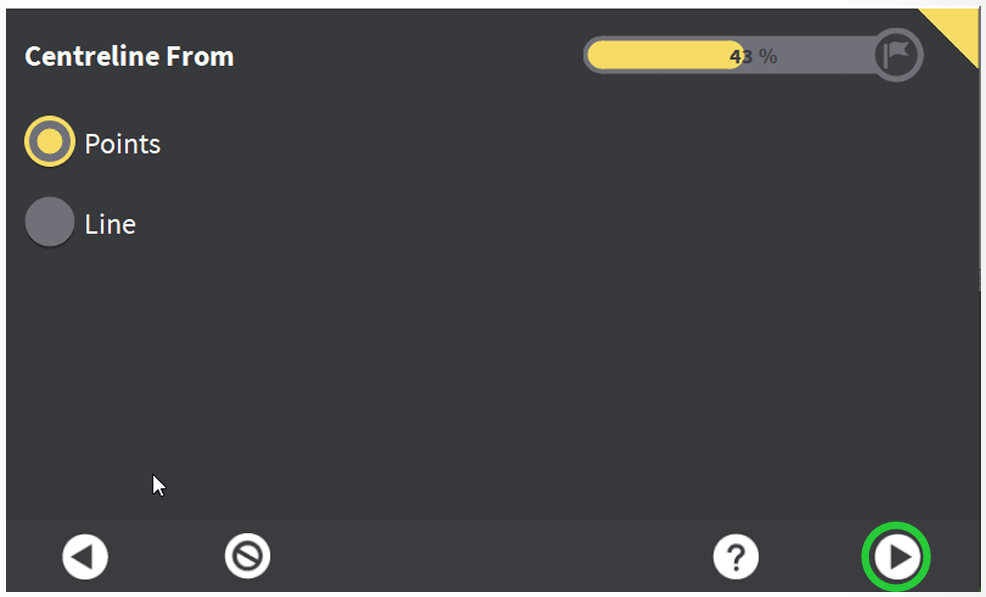 Centerline from Points: Select the Tool Point position you which to use (left, center or right side of bucket). Touch the tool point to the start of where you want your road model and hit Log New Point. Continue down the road logging points at each location where the road will make a bend. After all points have been logged, select each point in order on the Point Selection Screen then hit the arrow to proceed.