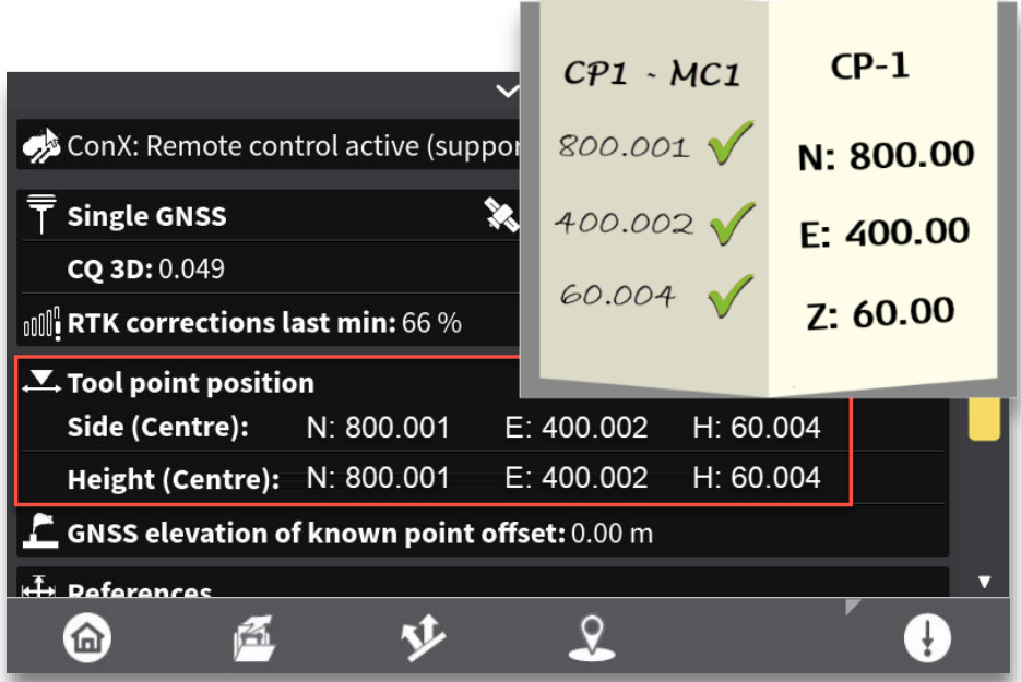 Compare the Height Tool Point Position to the Known Position of the Control Point. If differences exceed project specifications, please refer to our article on Adjusting Blade Wear/Calibrating a Dozer Cutting Edge.